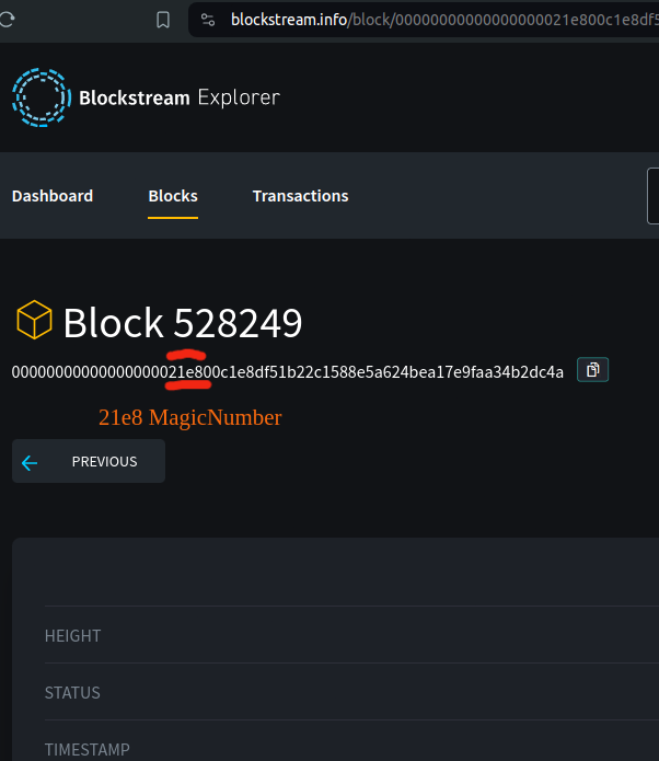 **21e8** (also **21e800** ) is a sequence of numbers and letters that appeared is a part of the block hash of block 528249, mined on the Bitcoin blockchain on June 19th, 2018. Due to a specific set of peculiarities surrounding the block hash, it has achieved a cult-like status and numerological significance within the community.